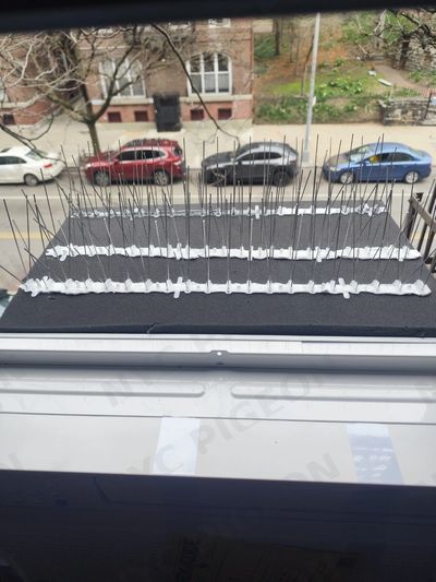 Pigeon Spike Strips. We install professional-grade stainless steel or polycarbonate spike strips along the top of your AC unit, along the window sill, and along the bracket ledge. Spikes do not harm birds — they simply make it physically impossible for pigeons to land and settle. Once the landing zone is removed, pigeons move on. Spike strips are durable, weather-resistant, and require virtually no maintenance. They are the single most effective long-term deterrent available for NYC window installations.
